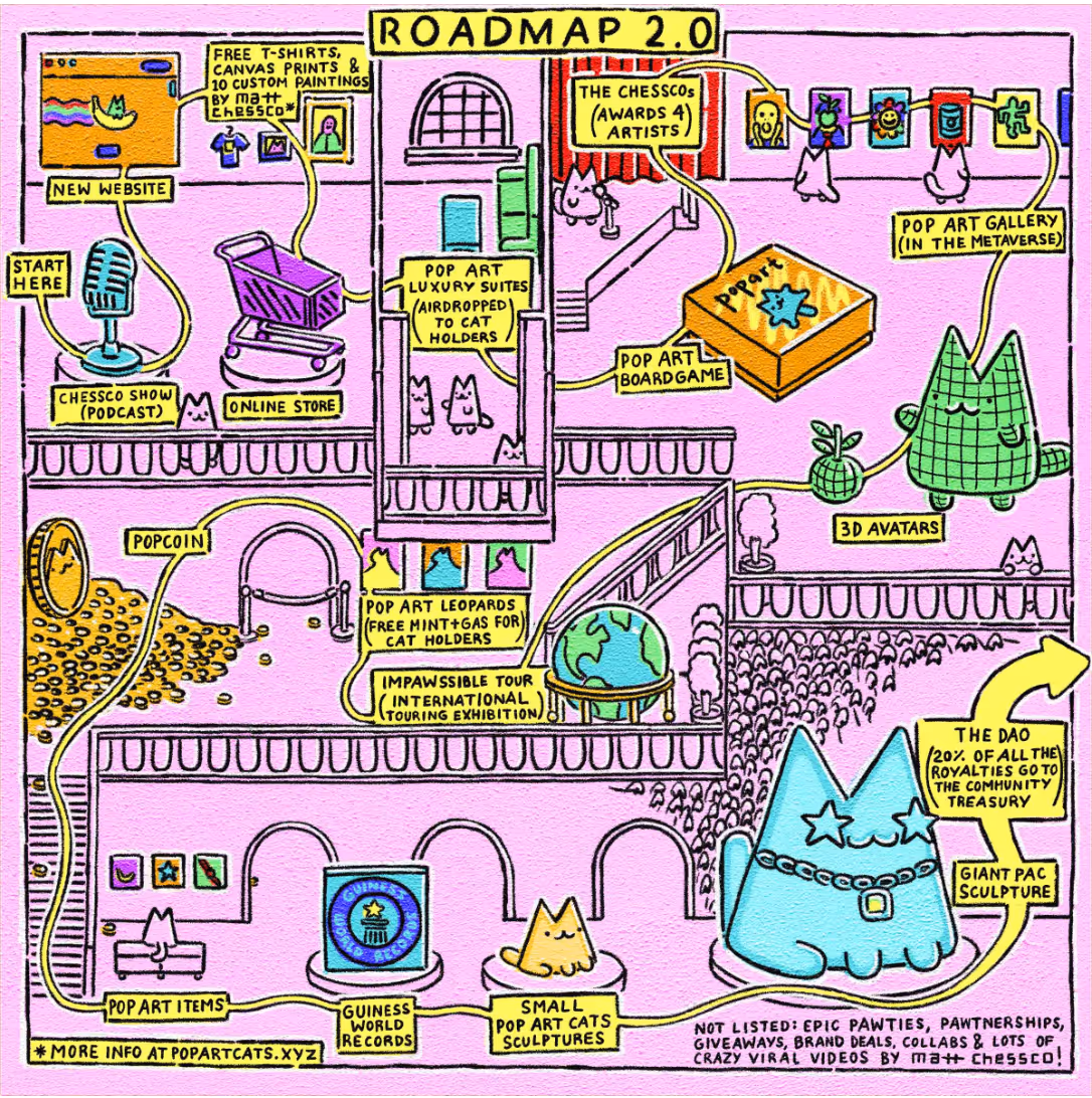 Pop Art Cats is a Digital Art collection by the artist Matt Chessco. It’s roadmap takes a playful approach providing it’s community with a map based outline of what to expect as the community grows and the artist produces more work.