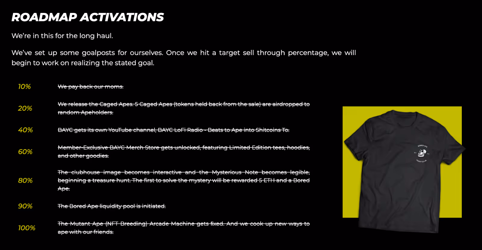 BAYC's NFT project roadmap is a great example of a simple yet effective approach to tracking progress. Instead of a detailed and elaborate plan, they have chosen to measure their progress by percentage of target sales. This approach might not be as elaborate but it is fully achieved which means that the team have accurately assessed their capabilities as developers and have delivered on their promises.