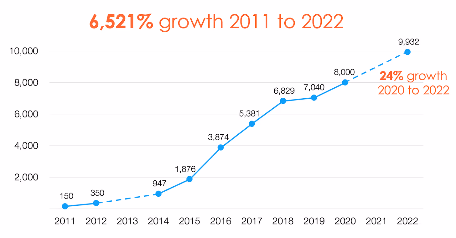 The importance of the MarTech category is at least partially substantiated by the sector's stratospheric growth – surging 6,571% or from 150 to 9.9k+ companies during the 2011 to 2022 period.