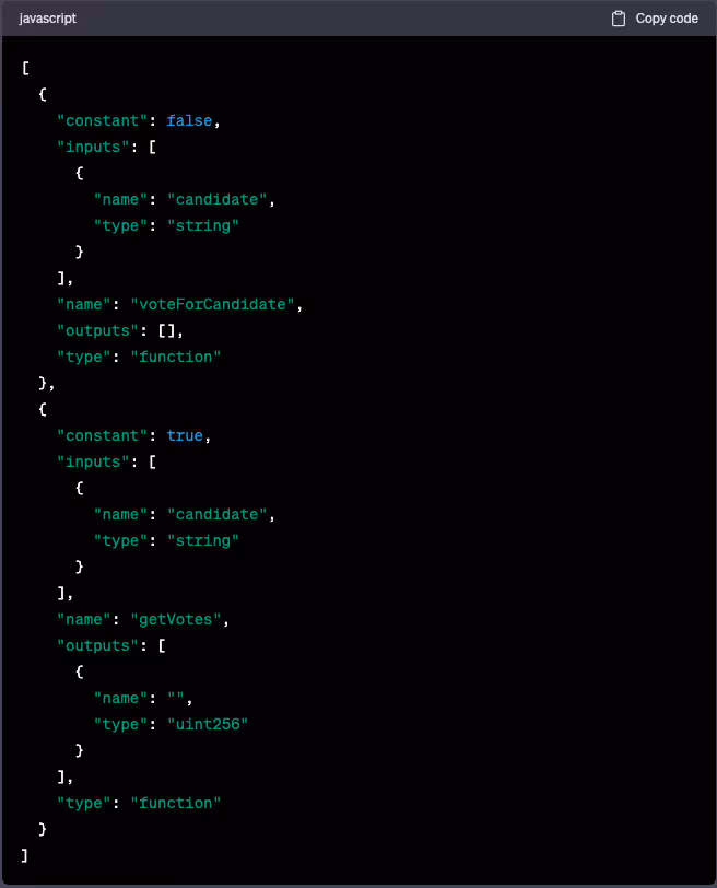 Conversely, when the contract returns data from a function call, the ABI is used to decode the returned bytecode back into a human-readable format. If you call ‘getVotes("Alice")’ and the contract returns 0x000000000000000000000000000000000000000000000000000000000000000a, the ABI tells your Ethereum client to decode that as a uint256, giving you the result 10.