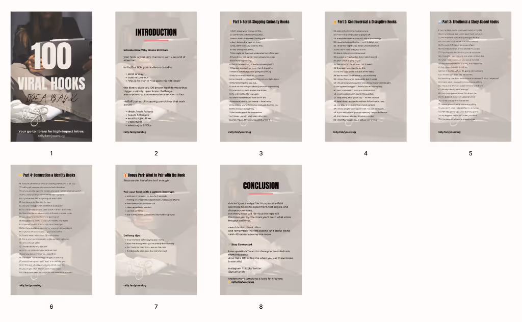Need stronger openings for Reels, TikTok, tweets, or email subject lines? The Viral Hooks Idea Bank distills the psychology of attention and hands you 30 proven hook formats plus delivery tips, so you win that first second instead of losing viewers to the next swipe.